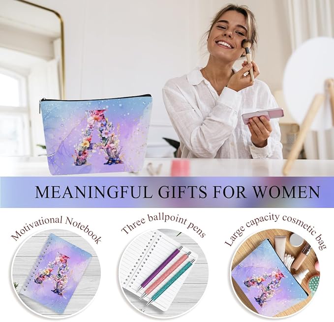 - Sufficient Quantity Personalized Gifts:This 6-pieces Letter surprise gift perfectly combines practicality and cuteness, making it an excellent choice to convey your heartfelt feelings! Our monogrammed gifts for women set contains a range of items; you will receive 1 x 20oz Tumbler with lid, 1x Notebook, 3 x push-on Glitter Ballpoint Pens, and 1 x Cosmetic Bag; the set is large enough to meet your gift needs.