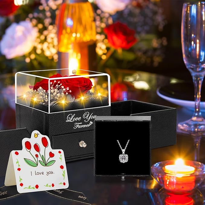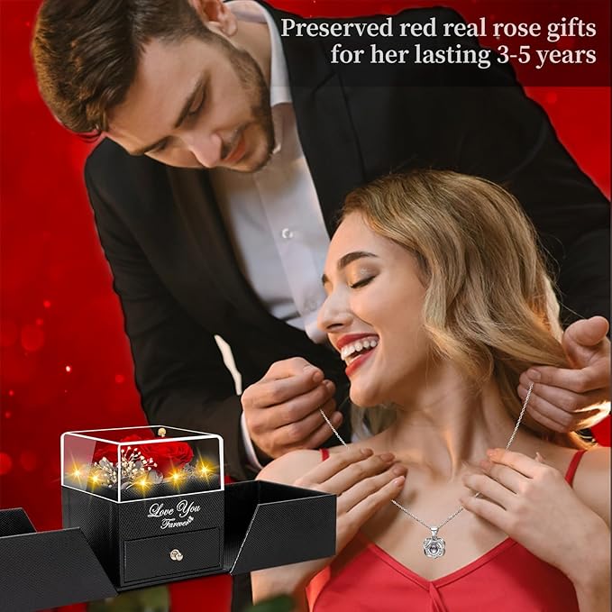 - โ [Package & Service] Premium packaging: a Gift box + a storage bag + a personalised greeting card. Each necklace is individually packaged in plastic bags to avoid scratches, and each rose is carefully Quality-checked. Storage tip: Avoid sunlight/ Humidity to extend lifespan. Ideal last-minute gifts for mum or girlfriend birthday presents. If you have any questions, please feel free to contact us.