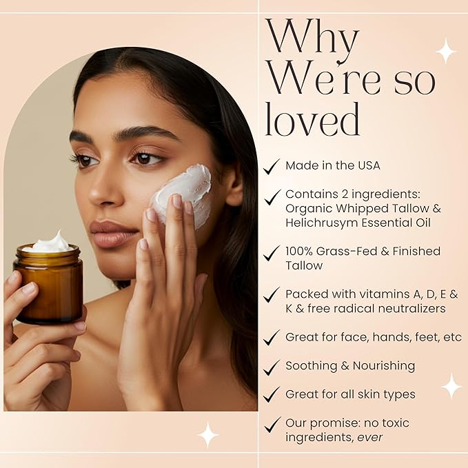 - ⭐ Our Helichrysum Balm is a deeply nourishing moisturizer made with just two powerful ingredients: organic grass-fed beef tallow and Helichrysum essential oil. Rich in skin-compatible nutrients, the tallow melts effortlessly into the skin, delivering lasting hydration, while Helichrysum supports a calm, radiant complexion. Use daily for soft, smooth, and naturally healthy-looking skin.