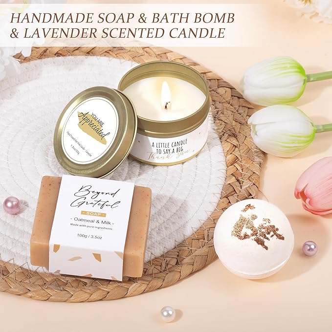 - APPRECIATION GIFTS FOR WOMEN: A thoughtful gift for those you appreciate, say 'thank you' with our gratitude deluxe gift box. When she opens this gift box, she will be filled with joy. This gratitude gift includes all 9 gifts: 1* 16oz glass cup, 1* handmade woven heart-shaped potted plant, 1*lavender soy wax scented candle, 1* handmade bar soap, 1* bath bomb, 1*silk eye mask, 1* pair of soft fuzzy socks, 1* gift card, 1* gift box.