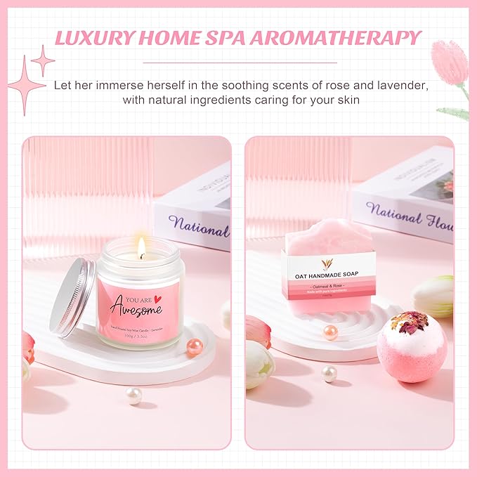 - 【UNIQUE BIRTHDAY GIFTS FOR WOMEN】 Enclosed in our elegant gift box, this "sending hug" gift set. The set includes a 16oz glass cup with a lid and straw, a 3.5oz lavender candle, a 2.6oz handmade oatmeal & rose soap, a 2.1oz bath bomb, fuzzy socks, a greeting card, a handmade knitted tulip-shaped potted ornament, an eye mask, a keychain, a hair scrunchie, and the gift box itself.