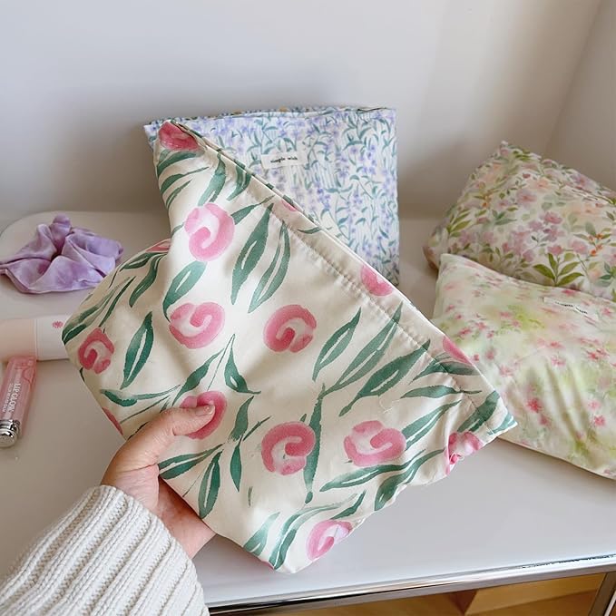 Wudygirl Cute Makeup Bag for Women - Travel Cosmetic Bag with Zipper Makeup Pouch Floral Make up Organizer Handbag Aesthetic (White Tulips)