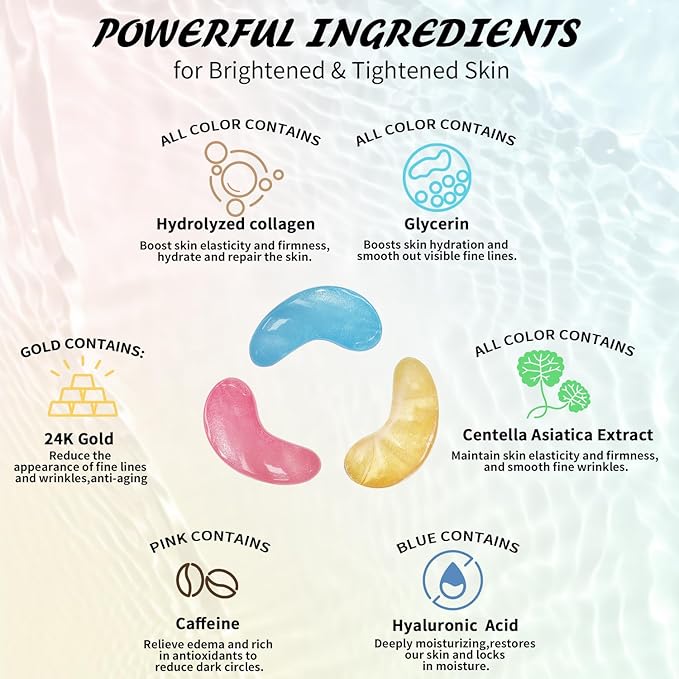 - Safe & Effective Ingredients: Our formula combines collagen, hyaluronic acid, caffeine, and a blend of natural plant extracts. These ingredients deeply repair and soothe the delicate skin around your eyes, protecting and rejuvenating without irritation. The ingredients of our under eye patches for dark circles and puffy eyes are vegan, sulfate-free, and gentle on all skin types.