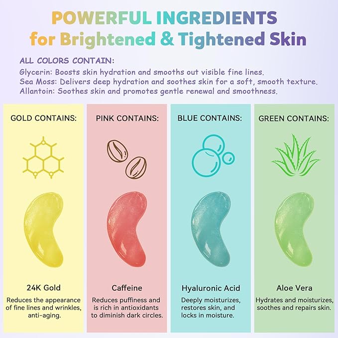 Under Eye Patches Variety Pack (24 Pairs), Eye Masks for Dark Circles Puffy Eyes Undereye Bags With 8 Colors (3 Pairs/Color), Vegan Eye Skin Care Set for Bachelorette Party Favors