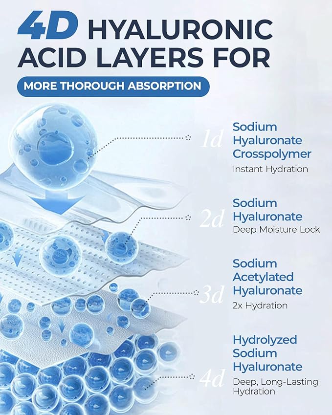 - 4D Hyaluronic Acid Complex For Deep Hydration: Our facial mask uses 4-layer hyaluronic acid technology, which locks, penetrates, and moisturizes the skin from the surface to the deep layer. The outer layer hydrates, while the inner layer retains moisture, providing a multi-layered moisturizing effect.Using it daily may help soothe, cool, and hydrate your skin all day