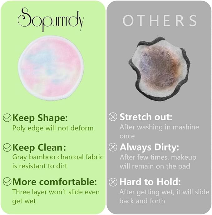 - GREAT CLEAN ALTERNATIVE-The soft rounds reusable pads 100% remove your makeup away with your favorite cleanser, you can apply your own cleanser to your face, wet the pads with warm water and in a circular motion wipe off all your makeup / dirt buildups etc. Another way is to wet the pads with warm water, put your favorite cleanser on the pad and in circular motion wipe off all your makeup away. Continue the process until your makeup is completely removed.