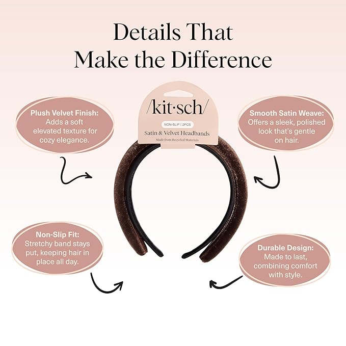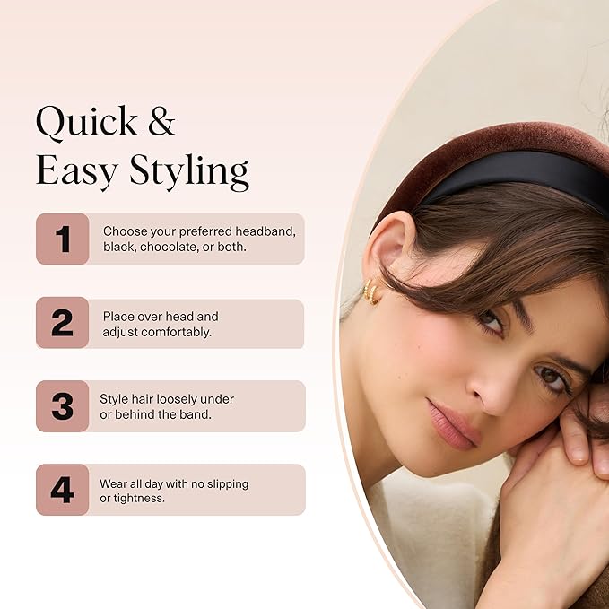 - TWO TEXTURES, ENDLESS STYLING OPTIONS: This set includes one plush velvet headband and one smooth satin headband in classic black and brown tones. These stylish headbands for women are designed to elevate any look from casual to polished. Soft and lightweight, they’re perfect hair accessories for daily wear, travel, or events. Whether worn as womens headbands or cute headbands for girls, they make styling simple, elegant, and effortless.