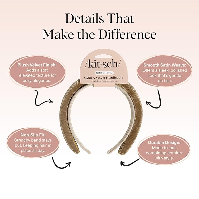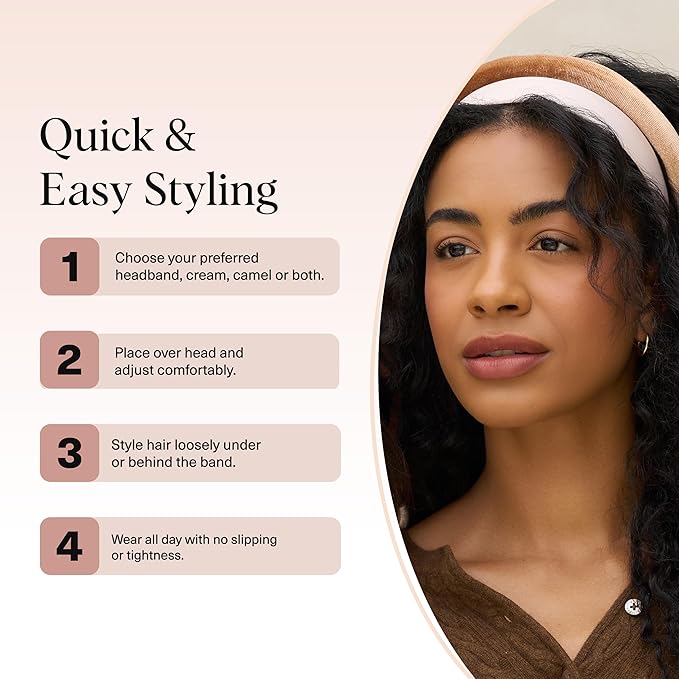 - TWO TEXTURES, ENDLESS STYLING OPTIONS: This set includes one plush velvet headband and one smooth satin headband in cream and camel tones. These stylish headbands for women are designed to elevate any look from casual to polished. Soft and lightweight, they’re perfect hair accessories for daily wear, travel, or events. Whether worn as womens headbands or cute headbands for girls, they make styling simple, elegant, and effortless.