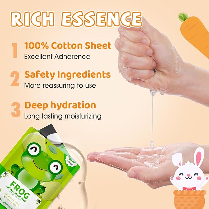 - 【18 Pack Animal Face Mask Set】This kids face mask set includes 9 cute animal characters:panda,tiger,bunny,pig,sheep,frog,deer,dog and zebra,2 pack facial masks of each pattern.Each face mask will make your skincare experience more fun,the animal designs bring a unique and wonderful enjoyment to your skincare routine