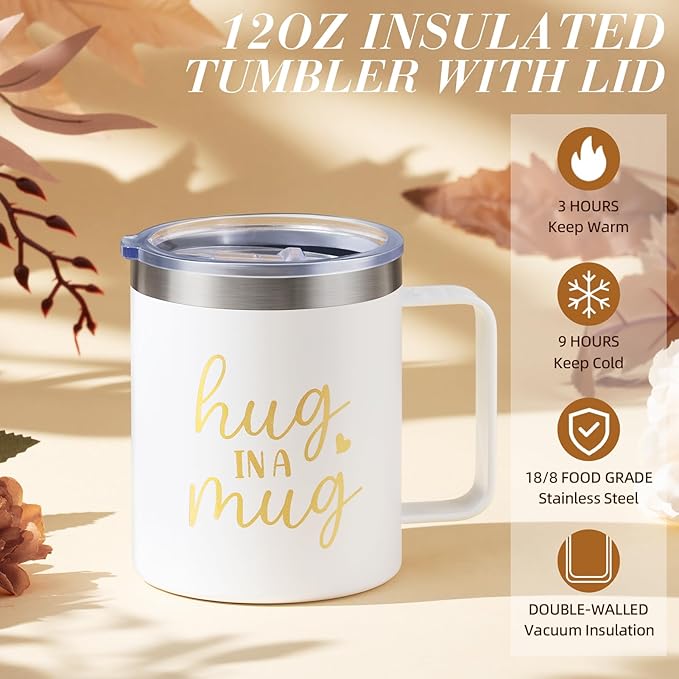 - INSULATED TUMBLER WITH HANDLE: Crafted from BPA-free, premium 18/8 food-grade stainless steel, this 12oz tumbler with handle features a double-wall vacuum design to keep beverages cold for up to 9 hours or hot for up to 3. “Hug in a Mug”—a comforting reminder that someone cares. Every sip brings warmth and calm, wrapping her heart in the cozy embrace of a hug. Suitable as sympathy gift baskets, care package, spa gift baskets, sending hug gifts, relaxation gifts for women mom best friend grandma
