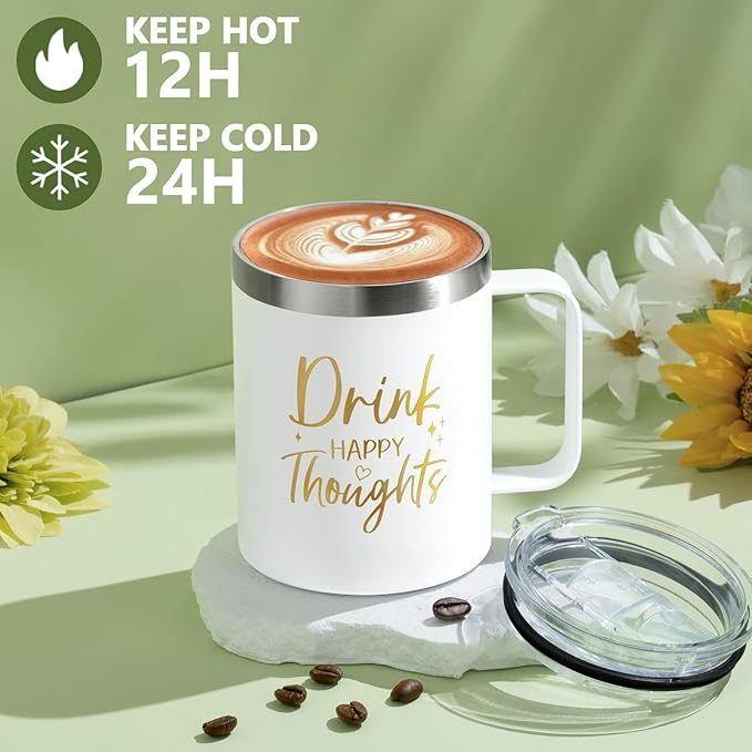 - INSULATED TUMBLER WITH HANDLE: Show your love and care with 12oz insulated tumbler in this self care gifts best friend birthday gifts for women, made from 18/8 stainless steel with double-walled vacuum insulation to keep beverages icy cold for 9 hours or piping hot for 3 hours. Perfect for iced coffee, tea, wine, juice, champagne, etc. The heartfelt "Drink Happy Thoughts" message makes it a meaningful gesture for anyone you cherish- ideal as motivational encouragement sunflower gifts for women
