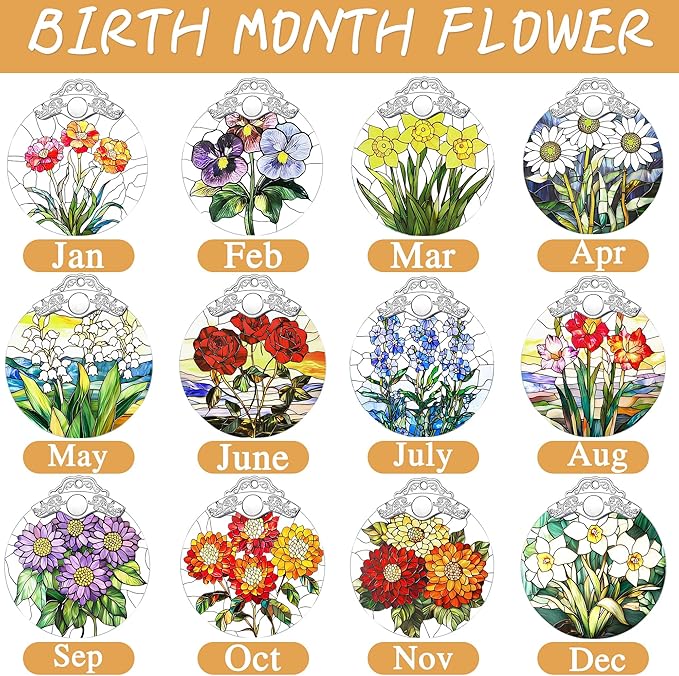 - ๐ธVibrant Design: Adorned with a richly detailed birth flower motif in brilliant, eye-catching hues, this stained glass ornament infuses your holiday decor with unparalleled warmth and cheer. Measuring approximately 3x3.5 inches, it strikes the perfect balance between subtlety and presence, its unique floral design adds a touch of personalized magic, turning ordinary spaces into festive retreats.