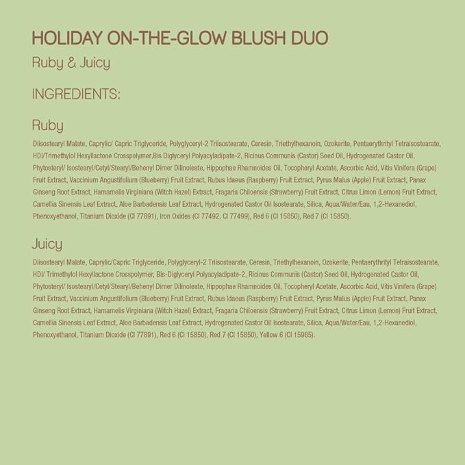 - Petite twist, major Glow! Pixi's On-the-Glow BLUSH Duo includes shades Ruby & Juicy in a holiday-ready set! Hydrating solid tints for cheeks and lips enriched with Ginseng, Aloe Vera and Fruit Extracts that deliver buildable, sheer colour with a dewy finish.