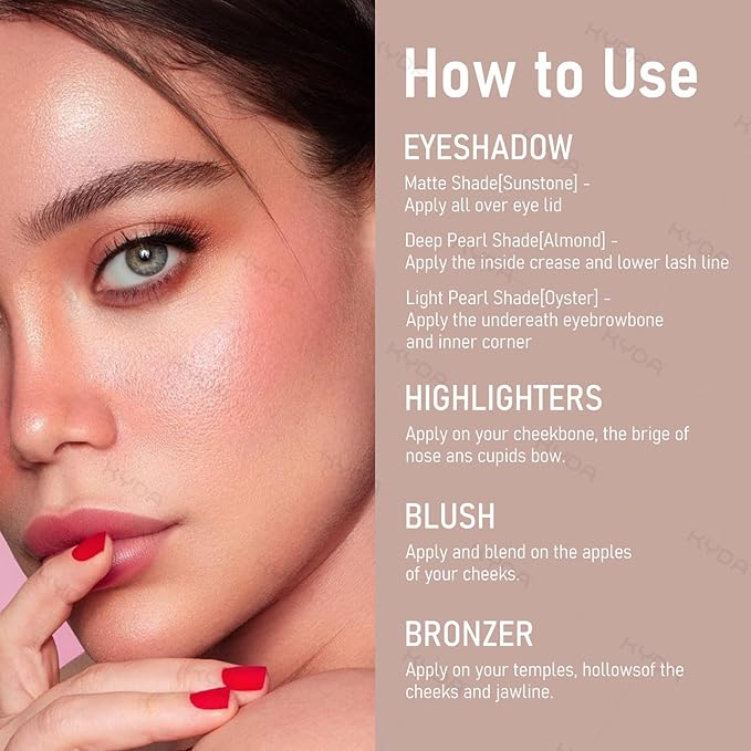 - 【How to Use】HIGHLIGHTER:Apply on your cheekbone, the bridge of nose and cupids bow. BLUSH:Apply and blend on the apples of your cheeks. EYESHADOW: Matte Shade[Sunstone] - Apply all over eye lid. Deep Pearl Shade[Almond] - Apply the inside crease and lower lash line. Light Pearl Shade[Oyster] - Apply the underneath brow bone and inner corner.